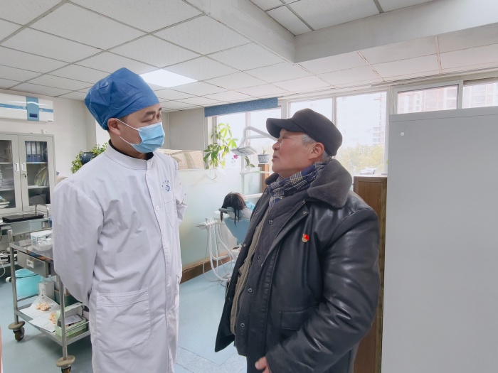 得知这位英雄的情况后,我院领导高度重视。院长王元银关切询问,要求务必为英雄提供最贴心、最优质的诊疗服务。医务部部长邵建迅速协调,开辟绿色通道,确保治疗流程顺畅无阻。修复科主任张维波领衔接诊,带领团队为老兵进行了细致全面的口腔检查与评估。考虑到患者的身体状况与实际需求,张维波团队经过审慎讨论,为他定制了个性化活动义齿修复方案。治疗过程中,医护人员格外耐心、细致,不仅精准考量修复体的功能性与舒适度,更时刻关注其心理感受,用温和的话语缓解可能的紧张情绪。每一步操作,都蕴含着对这位为国家奉献青春与健康的军人最深切的敬意与关怀。