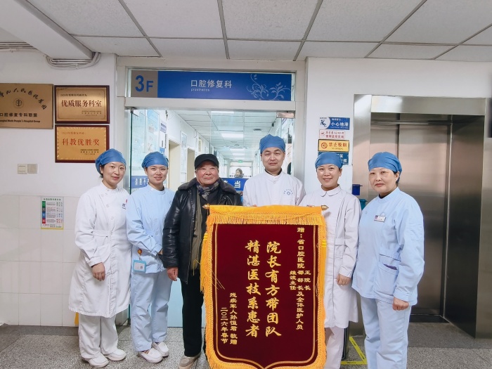 “没想到医院这么重视,从院长到主任、医生护士,都特别热情、特别照顾。”老兵感慨道。治疗结束后,老兵为我院领导及修复科张维波团队全体医护送上锦旗。崭新的义齿不仅改善了他的咀嚼功能,更让他重绽自信笑容。那笑容里,有欣慰,更有被尊重、被精心呵护的温暖。